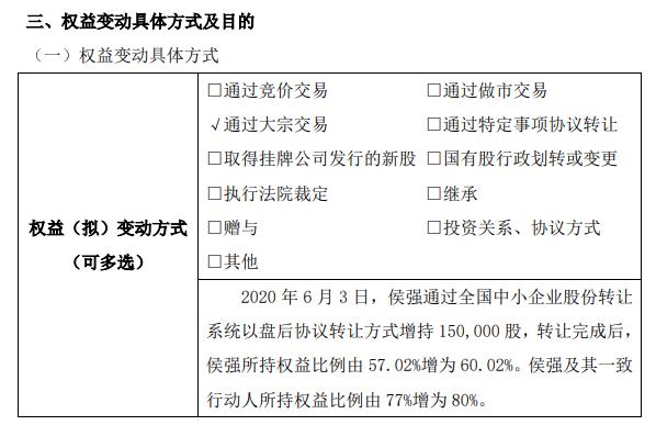 据挖贝网了解,实际控制人侯强在全国中小企业股份转让系统通过大宗交易方式完成15万股的增持,权益变动前侯强持股57.02%,权益变动后持股比例为60.02%。侯强及其一致行动人所持权益比例由77%增为80%。