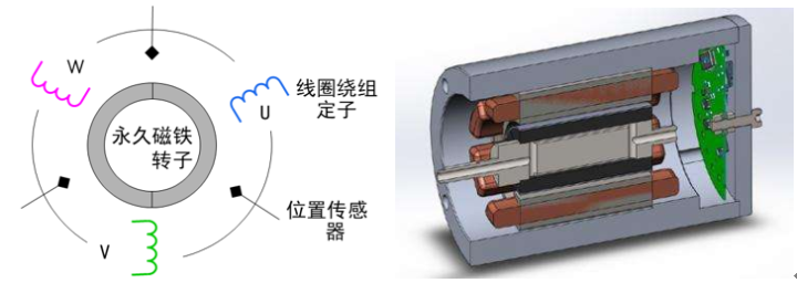 用装有永磁体的转子取代有刷直流电动机的定子磁极,用具有多相绕组的定子取代电枢,用位置传感器及控制器组成的电子换向器取代传统的机械换向器和电刷。这样,就得到了无刷直流电动机。