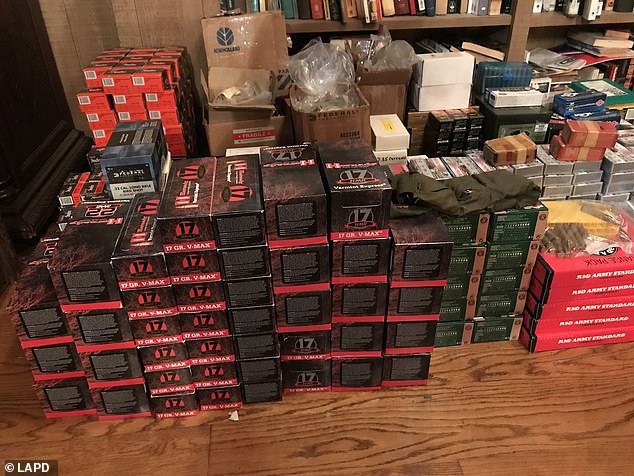 新闻直升机拍摄的照片显示,美国警方在洛杉矶一座价值700万美元的豪宅中缴获了大量武器。这些武器包括手枪、步枪还有大量子弹,警方正在进行清点。美国联邦烟酒枪炮及爆炸物管理局探员从霍姆比山的一座房屋中移走数百支枪,他们正与洛杉矶警察局展开联合调查。洛杉矶警方说,周三凌晨4点左右,在距离日落大道不远的北贝弗利格伦大道的家中,警方发出了搜查令。