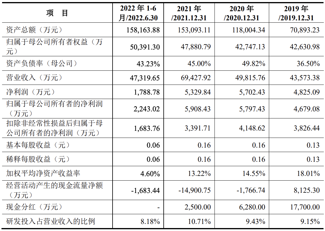 2019年、2020年、2021年和2022年上半年,清越科技的营收分别为4.36亿元、4.98亿元、6.94亿元和4.73亿元;净利润分别为4825.09万元、5702.43万元、5329.84万元和1788.78万元;扣非后净利润分别为3826.44万元、4148.62万元、3391.71万元和1683.76万元。