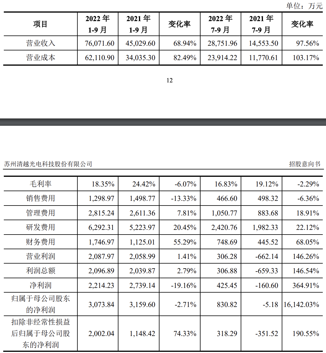 另据招股书披露,清越科技2022年1-9月(前三季度)的收入为7.61亿元,较2021年同期的4.50亿元增长68.94%;净利润2214.23万元,较2021年同期的2739.14万元减少19.16%;扣非后净利润2002.04万元,较2021年同期的1148.42万元增长74.33%。