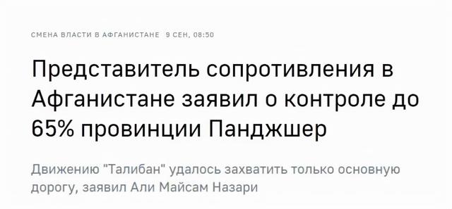 据俄塔社等外媒9日报道,在阿富汗东北部潘杰希尔省的反塔利班力量“民族抵抗阵线”(NRF)发言人阿里·迈萨姆·纳扎里在接受美国有线电视新闻网(CNN)采访时表示,“民族抵抗阵线”控制着潘杰希尔省多达65%的地区,塔利班只是控制了主要道路。