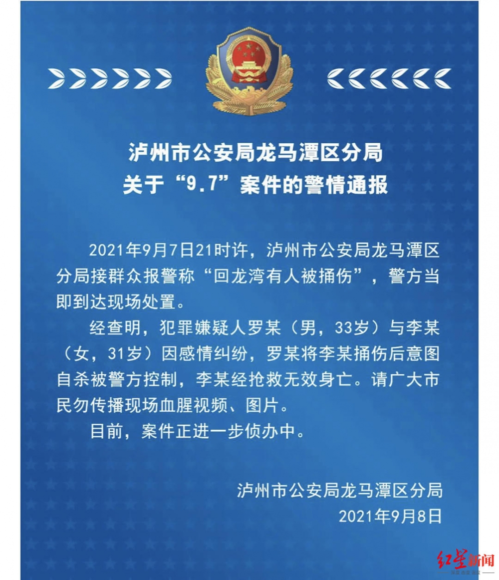 泸州市公安局龙马潭区分局关于“9.7”案件的警情通报称,9月7日21时许,泸州市公安局龙马潭区分局接群众报警称“回龙湾有人被捅伤”,警方当即到达现场处置。