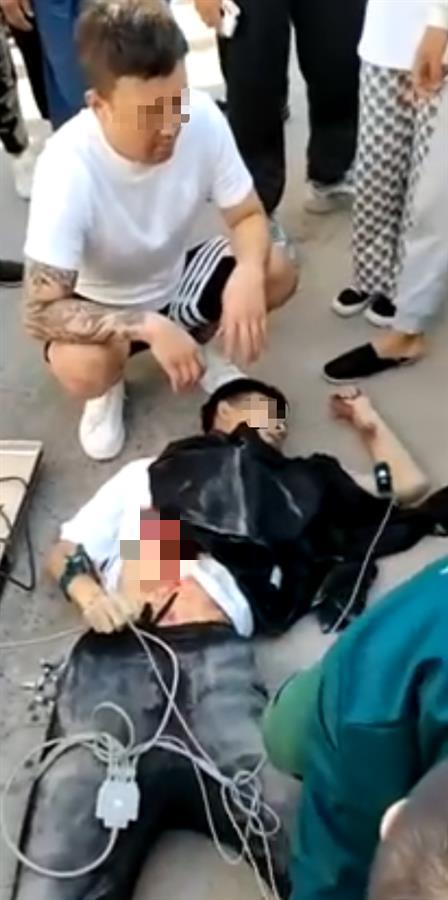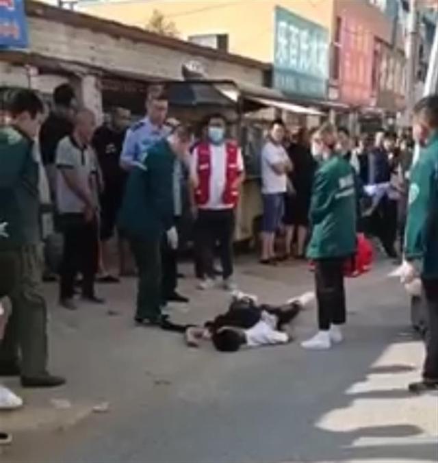 目击者拍摄的视频显示:在一猪肉店前,一女子抱着一年轻男子痛哭,男子腹部受伤,不能动弹。办案民警赶到现场正在拍照取证,医护人员也赶来急救。周围有众多群众围观。