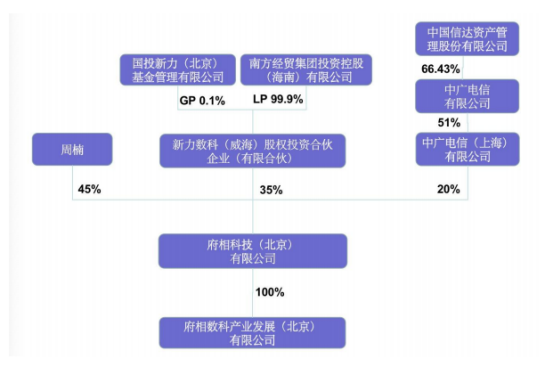 而周楠联合组成的持股平台--府相数科,背后就有海南省工业厅子公司南方经贸集团,以及中广电信、国投新力等实力不容小觑的集团。