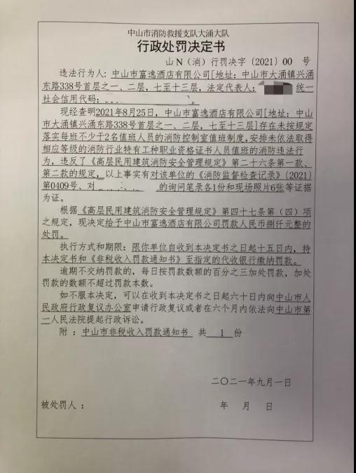 近日,中山市大涌消防救援大队监督检查员在检查中发现,位于大涌镇兴涌东路338号的富逸酒店消防控制室存在未按照规定落实消防控制室值班制度,工作人员也未依法取得相应等级的消防行业特有工种职业资格证书上岗的违法行为。对此消防部门责令该酒店进行限期整改,并根据《高层民用建筑消防安全管理规定》,对本次检查发现消防违法行为的酒店处以8000元整罚款。这是新规实施后,中山消防针对该类违法行为开具的全市第一张罚单。