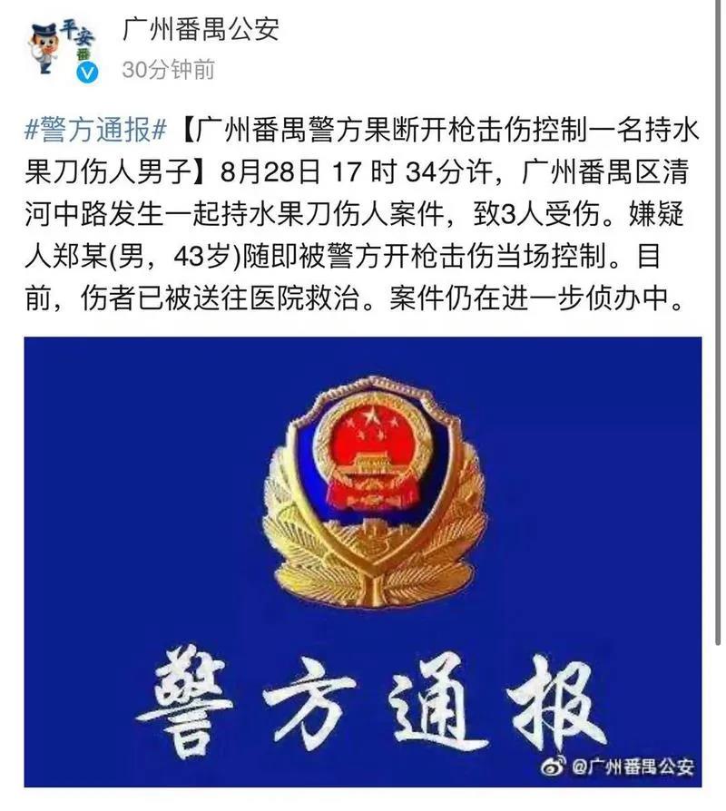 广州番禺公安通报:8月28日17时34分许,广州番禺区清河中路发生一起持水果刀伤人案件,致3人受伤。嫌疑人郑某(男,43岁)随即被警方开枪击伤当场控制。目前,伤者已被送往医院救治。案件仍在进一步侦办中。