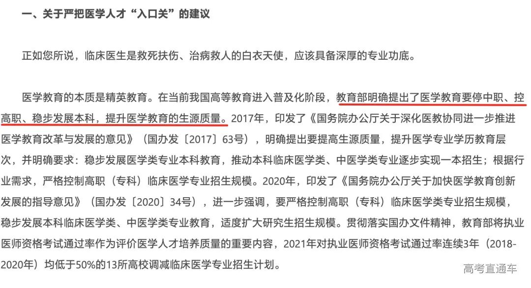 针对“关于扩大优质医学院校紧缺临床医学类人才招生规模的建议”,教育部答复称: