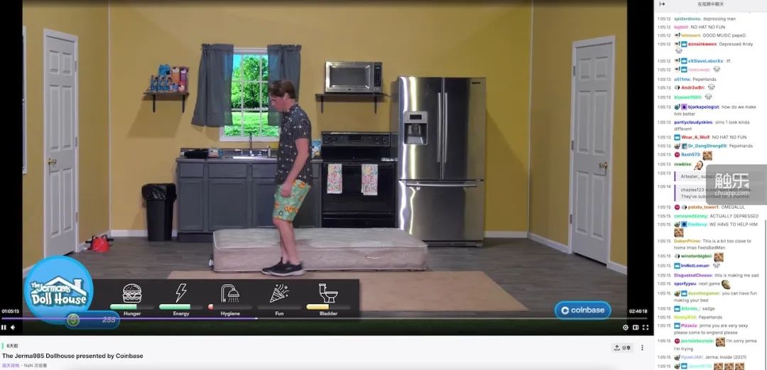 就像《模拟人生》里一样,起初主角几乎一无所有。在这场直播刚开始的时候,杰里米只有一间简陋的一室一厅和门前的一块小草地,房子里也只有一些初始化的设备,比如橱子、冰箱、垃圾桶等等,没有床。浴室里只有马桶、淋浴房和洗手台,当然,还有一大块空地。起初没有床的日子里,杰里米就睡在这块空地上。在首次直播的中期,观众们给他选了一张床垫——那张床垫脏得跟刚从泥雨里抢救出来一样,他就只能睡在那上面。